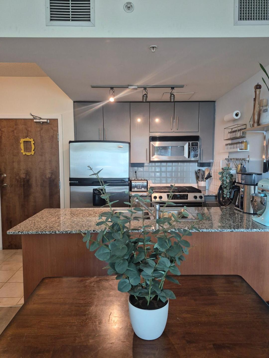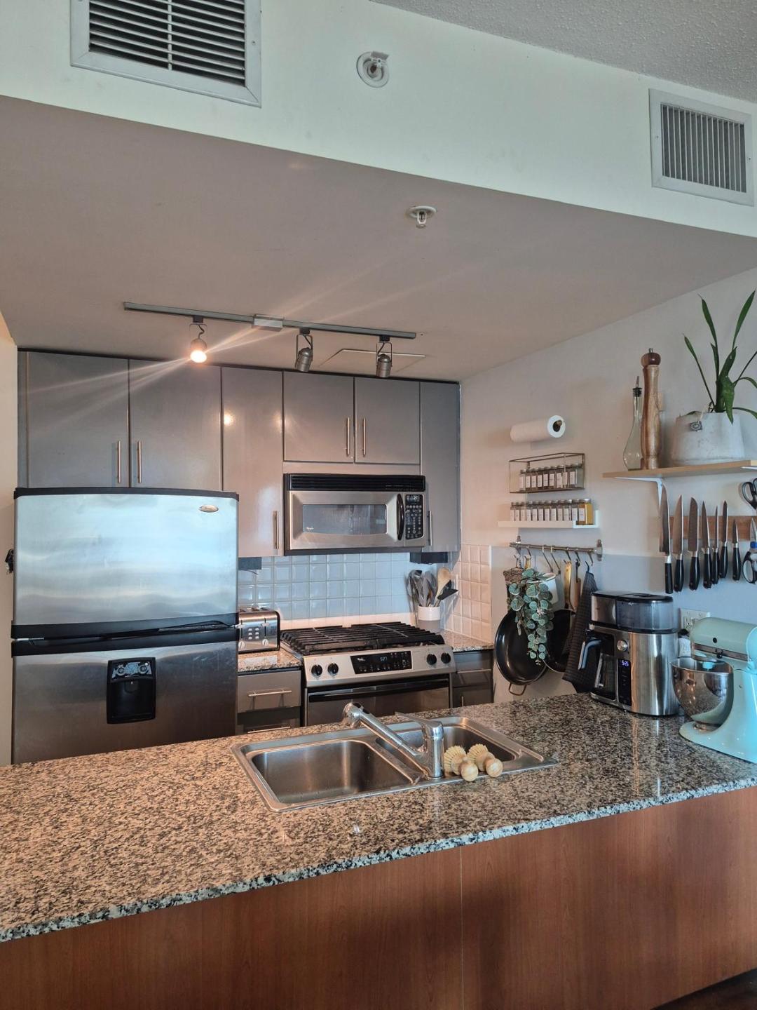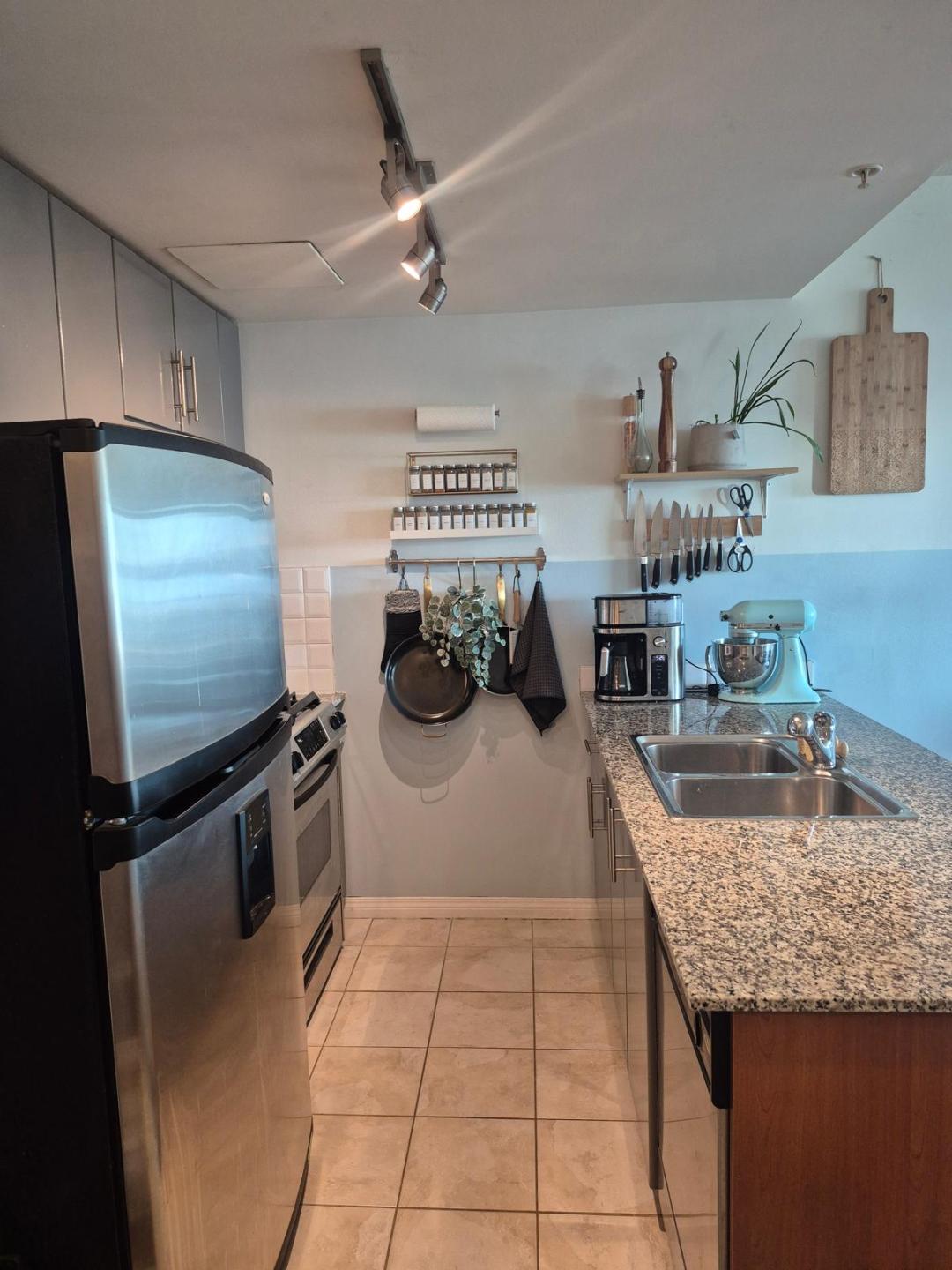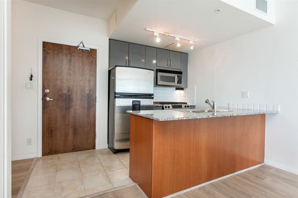 Bright south-facing condo with harbour & city views, Spacious open concept layout with 9’ ceilings, Gourmet kitchen with granite counters & stainless steel appliances, Cozy electric fireplace, In-suite laundry for your convenience, Air conditioning for year-round comfort, Balcony to enjoy fresh air and views